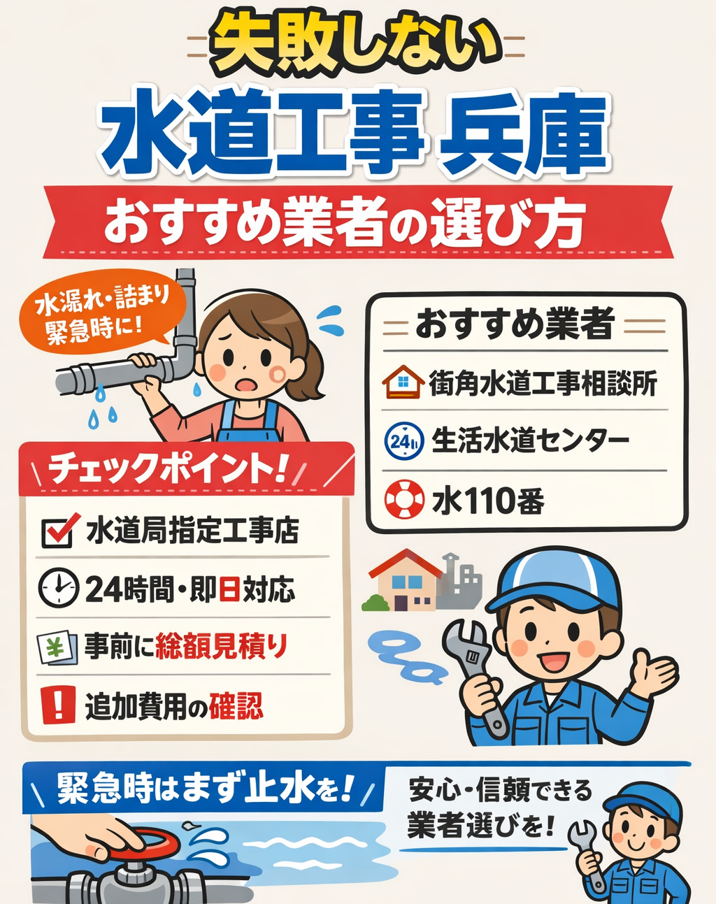 水道工事を兵庫でおすすめ業者を選ぶ際は、必ず「作業内容」「部品代」「出張費」「夜間料金」の4項目を確認してください。